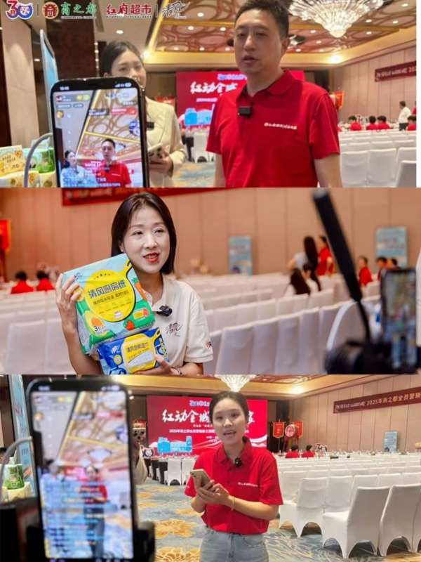 直播上半場(chǎng)聚焦活動(dòng)價(jià)值與產(chǎn)品品質(zhì)傳遞,通過實(shí)時(shí)連線帶領(lǐng)觀眾沉浸式體驗(yàn)啟動(dòng)會(huì)現(xiàn)場(chǎng),并邀請(qǐng)紅府超市總經(jīng)理助理鄭遠(yuǎn)征、安徽省辦推廣經(jīng)理陳燕、紅府運(yùn)營(yíng)推薦官魏杰等多位嘉賓,分別從“紅動(dòng)全城——紙品節(jié)第十季”的升級(jí)福利、原料選擇與生產(chǎn)工藝、團(tuán)購商品亮點(diǎn)等維度進(jìn)行專業(yè)解讀,品牌方代表亦通過實(shí)物細(xì)節(jié)展示,進(jìn)一步強(qiáng)化了消費(fèi)者對(duì)紅府紙品的品質(zhì)信任。