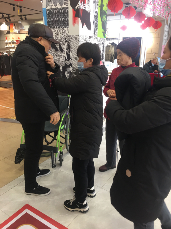 下午4時許,一對耄耋老人進入商場內(nèi),老先生坐在輪椅上,老伴推著。在阿迪專柜旁邊的通道,老奶奶在老先生的耳邊叮囑了幾句,便徑直乘扶梯上了二樓,不一會兒“名鷹”專柜的導(dǎo)購員王芳萍陪著老奶奶下樓,手里還拿著一件棉衣。原來老奶奶是給老伴選衣服去了。王芳萍給老先生穿上衣服,詢問老先生衣服合不合身,有沒有哪兒穿著不舒服。老先生很執(zhí)拗,說自己穿的衣服好好的,家里好幾件棉衣,怎么都不愿再添新衣了,借故說衣服長度不合適推掉了。老奶奶耐心地哄著老伴,繼續(xù)到二樓賣場別的專柜挑選衣服。不一會兒,她又在“雅鹿”專柜選了一件羽絨服,導(dǎo)購員葛運運隨即另外拿了件其他的尺碼的羽絨服跟隨下樓。葛運運幫老人穿好衣服,還詳細(xì)介紹這款羽絨服填充的是今年最流行的鵝絨,不僅更保暖還很輕便,長度也剛好,不會給坐在輪椅上的老人帶來不舒服感。老人經(jīng)不住老伴的勸說,試穿比較后答應(yīng)買下。