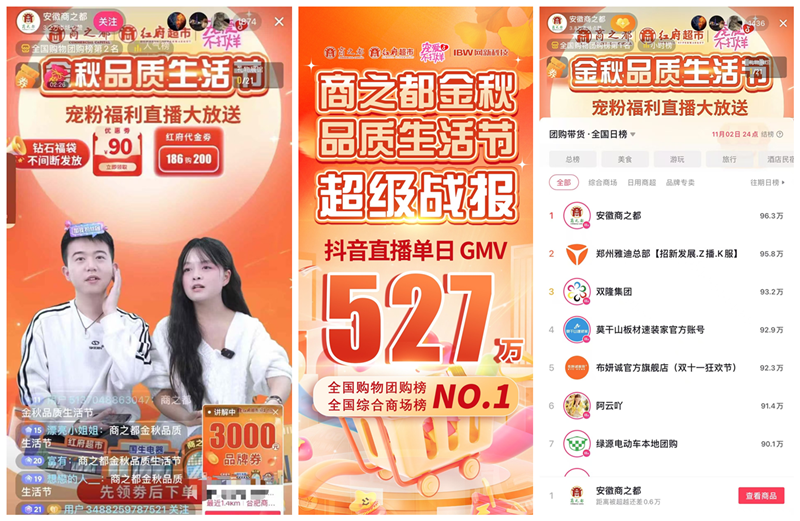11月2日晚22:00,安徽商之都官方抖音直播首秀圓滿結(jié)束,迎來(lái)首秀開門紅,為“大干四季度”添上濃墨重彩的一筆。首播GMV(注:成交總額)突破527萬(wàn),在全國(guó)綜合商場(chǎng)榜和全國(guó)購(gòu)物團(tuán)購(gòu)榜雙第一,憑借火爆的銷售表現(xiàn)引起消費(fèi)者的熱烈反響和業(yè)內(nèi)的高度關(guān)注,充分展示了“商之都”品牌影響力和市場(chǎng)競(jìng)爭(zhēng)力。