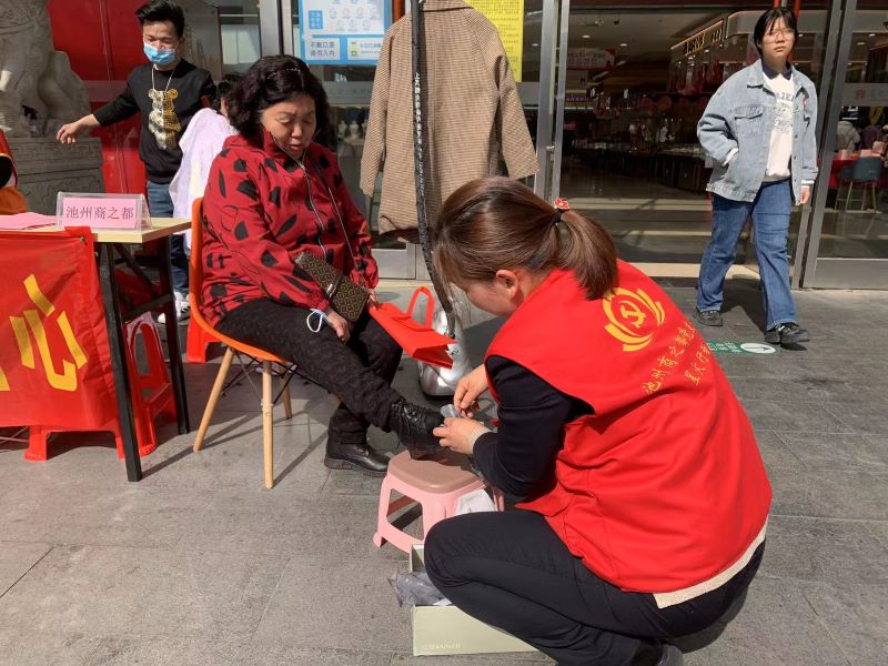 3月5日上午,池州購(gòu)物中心黨支部聯(lián)合市商務(wù)局、市民政局、市總工會(huì)開(kāi)展“3.5雷鋒日公益行動(dòng)”活動(dòng),活動(dòng)現(xiàn)場(chǎng)免費(fèi)為顧客熨燙衣物、擦皮鞋、發(fā)放無(wú)障礙退換貨宣傳單頁(yè)等志愿活動(dòng)。