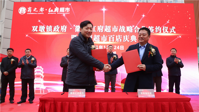 2021年12月24日上午9:58分,紅府超市第100家門店雙墩花園店開業(yè)慶典暨紅府超市與雙墩鎮(zhèn)戰(zhàn)略合作協(xié)議簽約儀式盛大舉行。長豐縣人民政府黨組成員、副縣長安鑫,長豐縣雙墩鎮(zhèn)黨委副書記、鎮(zhèn)長王世德,長豐縣商務(wù)局副局長朱紀海,長豐縣雙墩鎮(zhèn)黨委副書記劉學(xué)松,徽商集團黨委委員、副總經(jīng)理王亮,商之都黨委書記、董事長張盛,商之都黨委委員、總經(jīng)理、紅府超市董事長王正,紅府超市總經(jīng)理陳航,合肥賽達賽商業(yè)管理有限公司董事長陶偉應(yīng)邀參加合作協(xié)議簽約和新店開業(yè)儀式,集團公司王亮副總經(jīng)理和長豐縣副縣長安鑫分別致辭。