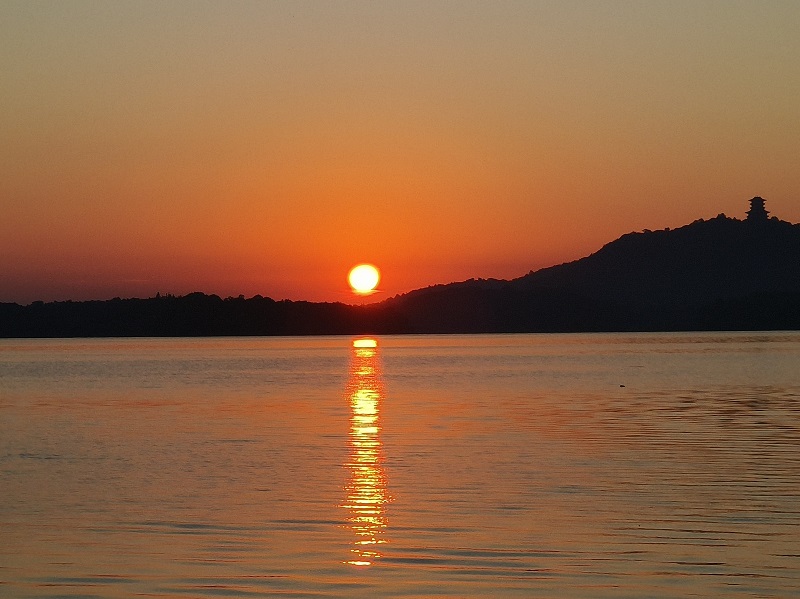 圖片描述:平天湖日出時(shí),太陽從遠(yuǎn)山后緩緩升起,將天空染成橙紅。湖面如鏡,倒映著金色光芒,水波輕漾,整個(gè)畫面靜謐又絢爛。