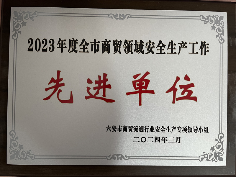 日前,六安市商貿(mào)流通行業(yè)安全生產(chǎn)專項領(lǐng)導(dǎo)小組授予六安商廈“2023年度六安市商貿(mào)領(lǐng)域安全生產(chǎn)工作先進單位”。