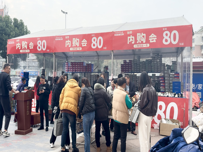 隨著天氣轉(zhuǎn)涼,六安商廈從 11 月中旬開始,經(jīng)過與當(dāng)?shù)刂鞴懿块T的溝通申請(qǐng),在商廈廣場(chǎng)搭建一組三間促銷棚,男女鞋及箱包等豐富貨源齊聚于此,并通過短視頻、朋友圈以及 VIP 顧客群等多渠道宣傳,吸引了大量顧客的關(guān)注和購(gòu)買,實(shí)現(xiàn)單日銷售3萬元業(yè)績(jī),充分發(fā)揮了廣場(chǎng)效應(yīng)。