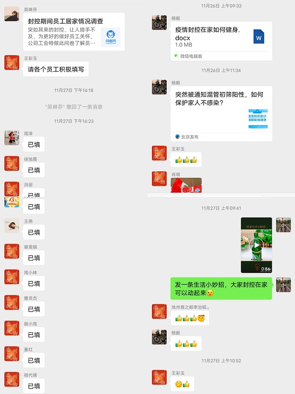 11月24日晚十點(diǎn)貴池區(qū)對部分街道強(qiáng)化管理。次日,池州商之都購物中心所有員工居家辦公,只留物業(yè)服務(wù)部的幾個(gè)員工留守商場。為了穩(wěn)定員工情緒、為員工解壓,池州商之都工會(huì)立刻在微信群召開會(huì)議,討論特殊時(shí)期在線上通過什么形式豐富員工業(yè)余生活。工會(huì)委員輪班每天在員工微信群推送疫情防護(hù)小知識(shí)、小妙招和健身指南。