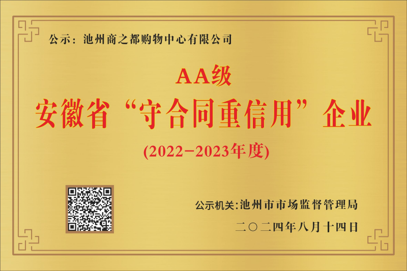 經(jīng)自主申報、市場監(jiān)督管理部門嚴(yán)格審核、實(shí)地核查,以及公示等多個環(huán)節(jié)的嚴(yán)格篩選,池州商之都購物中心成功獲評2022-2023年度安徽省AA級“守合同重信用”企業(yè)榮譽(yù)稱號。