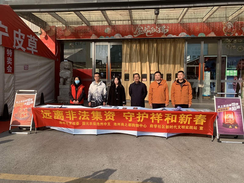 新春來臨之際,為提高群眾風險防范意識,遠離非法集資陷阱,池州市法改委聯(lián)合國元農(nóng)保池州中支、府學社區(qū)、池州購物中心在商之都內(nèi)街廣場進行“遠離非法集資 守護祥和新春”普法宣傳。