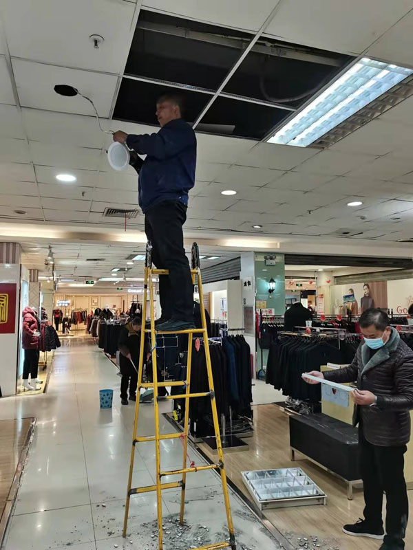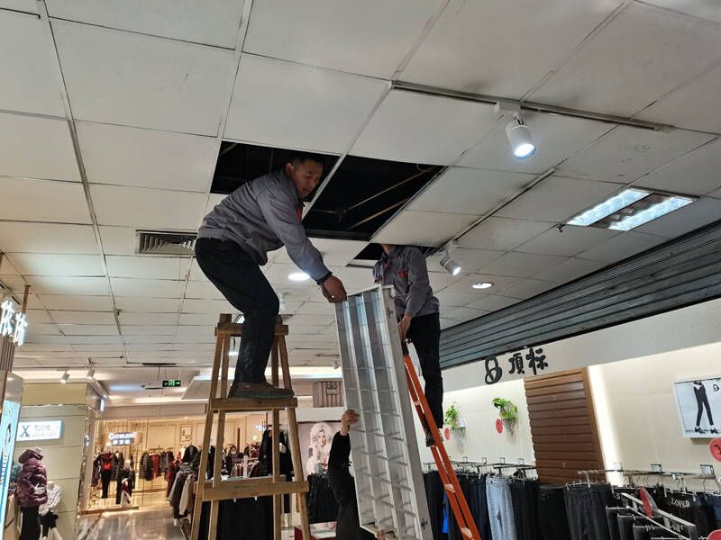 為了讓賣場照明設(shè)備既明亮又節(jié)能,后勤保障部電工班同志幾次跑市場找合適燈具,對多處頂部照明進(jìn)行更換??紤]到頂部天花板的承重等因素,還要對其進(jìn)行二次加固,所以更換一套格柵燈一個(gè)人需要在梯子上忙活近30分鐘,下來時(shí)腿腳已接近麻木。二樓扶手電梯頂部損壞的燈具更換起來很繁瑣,距離太高梯子高度夠不著,后勤保障部電工班摸索出了“小妙招”,自制工具輕松解決,而且不影響電梯的正常運(yùn)轉(zhuǎn)。