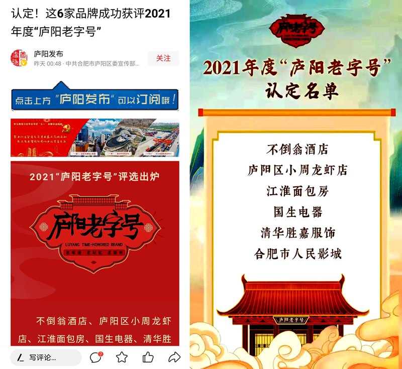 評選活動開啟以來,受到社會各界廣泛關(guān)注,經(jīng)過專家評審、社會公示,最終,國生電器、合肥市人民影城等6個品牌成功獲評2021年度“廬陽老字號”。至此,“廬陽老字號”大家庭成員擴充至28個。