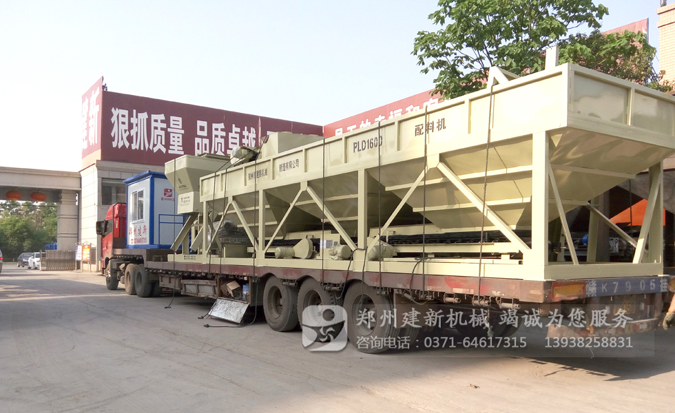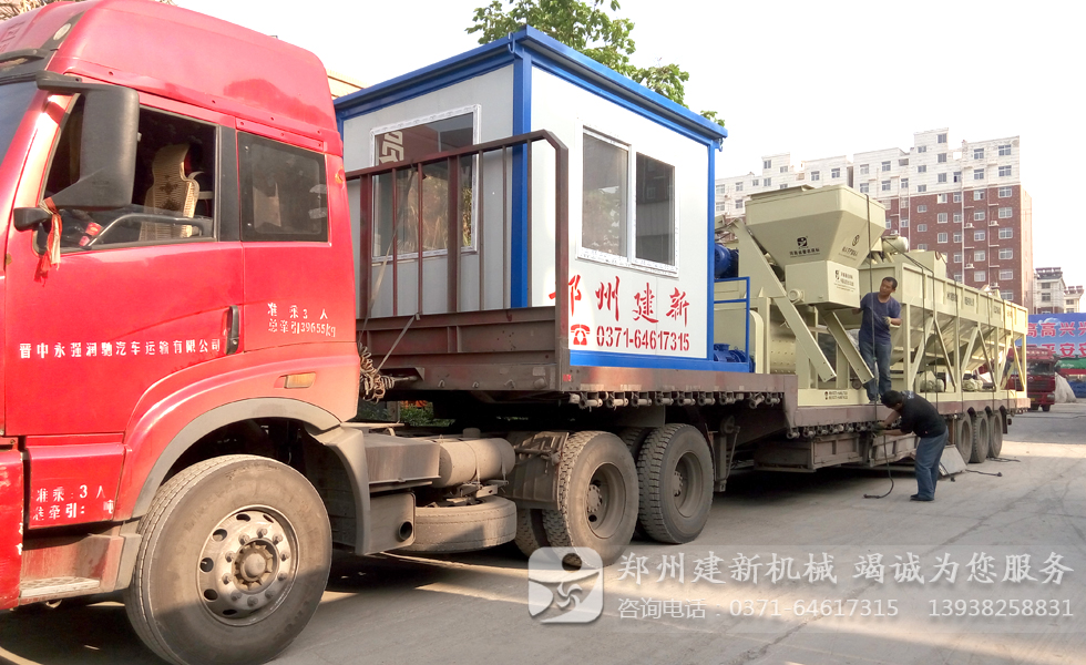 圖中顯示一套HZS50混凝土攪拌站已經(jīng)裝車完畢,正在做最后的檢查與固定工作,發(fā)貨清單中包含了一臺JS1000強制式混凝土攪拌機,一臺空氣壓縮機,控制室一個,PLD1600混凝土配料機一套以及其它配套的組件。