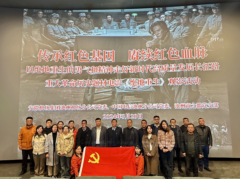 3月20日下午,池州購(gòu)物中心黨支部與安徽機(jī)場(chǎng)集團(tuán)池州機(jī)場(chǎng)分公司黨委、中國(guó)電信池州分公司黨委聯(lián)合開展“傳承紅色基因,賡續(xù)紅色血脈”黨建共建觀影活動(dòng),組織觀看重大革命歷史題材影片《絕地重生》,引導(dǎo)黨員更好地傳承紅色基因、賡續(xù)紅色血脈,弘揚(yáng)革命精神。