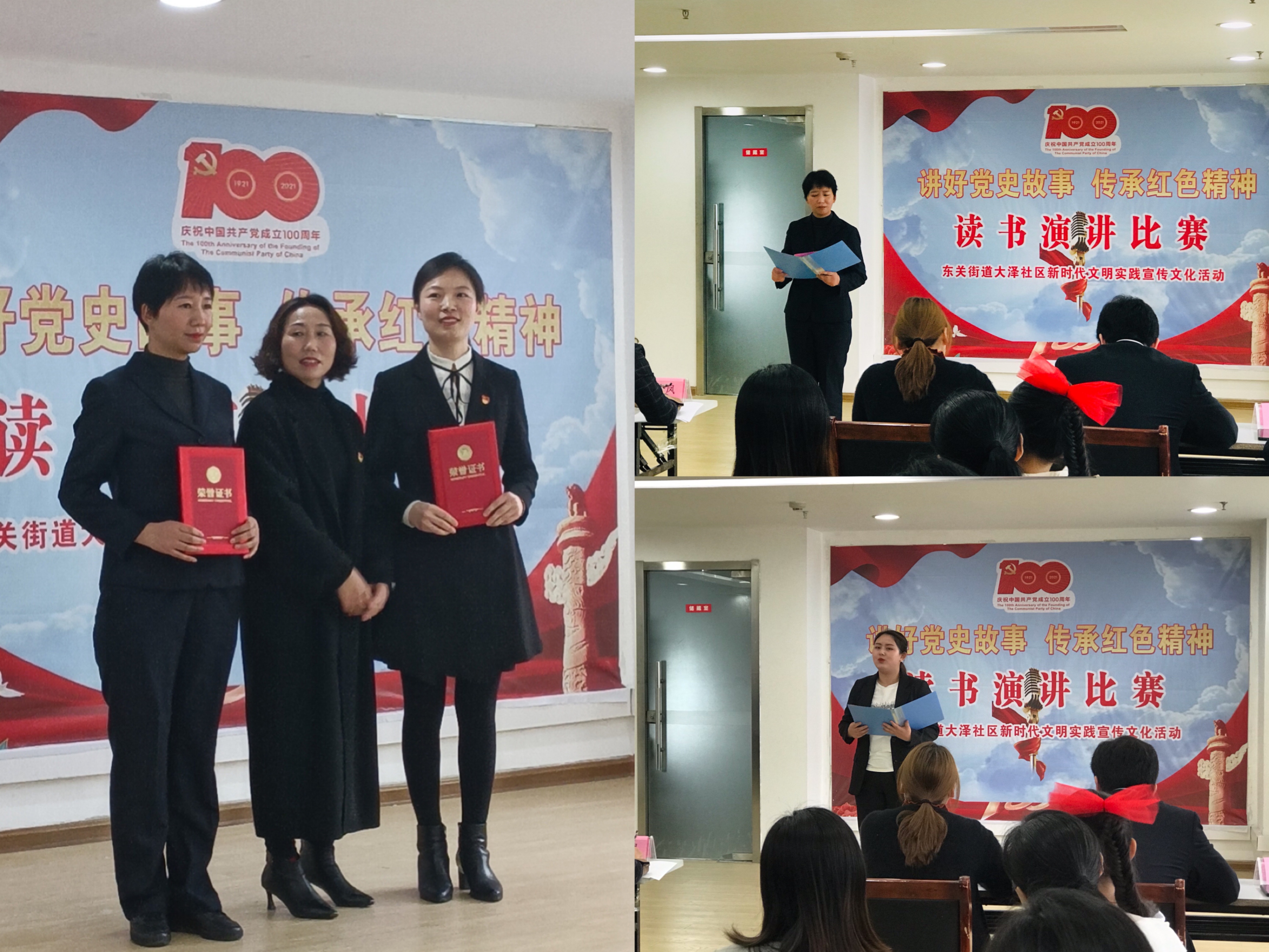 4月25日下午,宿州商廈所在轄區(qū)東關(guān)街道大澤社區(qū)舉辦了一場“講好黨史故事·傳承紅色精神”為主題的讀書演講比賽,商廈選派張芳芳、尹文冰兩名員工參加了比賽,經(jīng)過激烈角逐,張芳芳獲得演講比賽二等獎。
