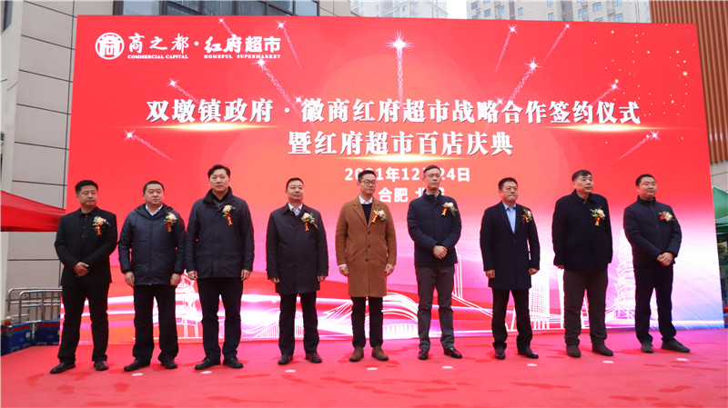 2021年12月24日上午9:58分,紅府超市第100家門店雙墩花園店開業(yè)慶典暨紅府超市與雙墩鎮(zhèn)戰(zhàn)略合作協(xié)議簽約儀式盛大舉行。長豐縣人民政府黨組成員、副縣長安鑫,長豐縣雙墩鎮(zhèn)黨委副書記、鎮(zhèn)長王世德,長豐縣商務(wù)局副局長朱紀海,長豐縣雙墩鎮(zhèn)黨委副書記劉學(xué)松,徽商集團黨委委員、副總經(jīng)理王亮,商之都黨委書記、董事長張盛,商之都黨委委員、總經(jīng)理、紅府超市董事長王正,紅府超市總經(jīng)理陳航,合肥賽達賽商業(yè)管理有限公司董事長陶偉應(yīng)邀參加合作協(xié)議簽約和新店開業(yè)儀式,集團公司王亮副總經(jīng)理和長豐縣副縣長安鑫分別致辭。