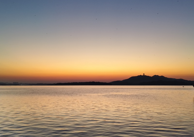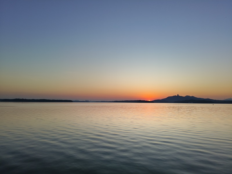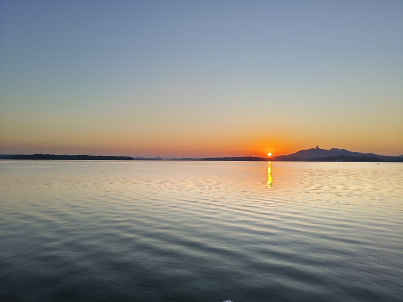 圖片描述:平天湖日出時(shí),太陽從遠(yuǎn)山后緩緩升起,將天空染成橙紅。湖面如鏡,倒映著金色光芒,水波輕漾,整個(gè)畫面靜謐又絢爛。