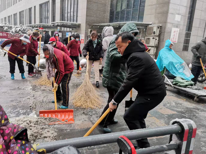 2月7日年初七第一天開工,天空中雪花飄飄,地面一層厚厚的積雪。中心廣場黨員、群眾在支部書記陳功帶領(lǐng)下,對商場門前廣場、周邊道路、內(nèi)街等處積雪進行清掃。