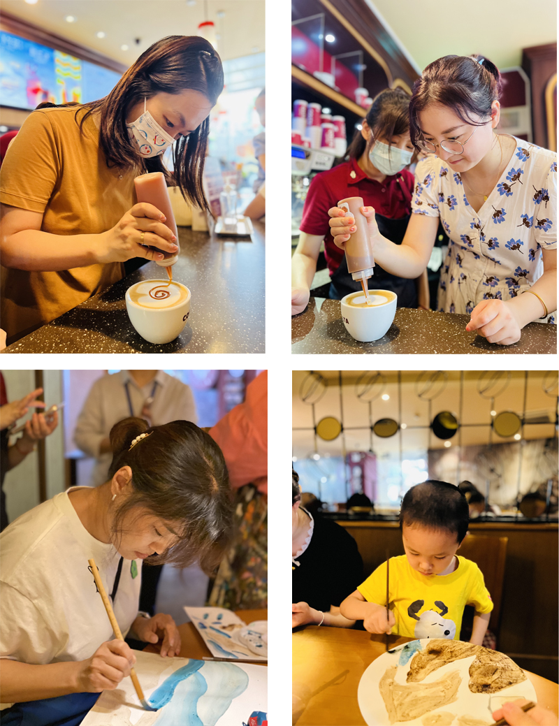 COSTA講師詳細(xì)介紹了咖啡禮儀和文化知識(shí),并和家長(zhǎng)們互動(dòng)交流。家長(zhǎng)們?cè)诘陠T協(xié)助輔導(dǎo)下體驗(yàn)發(fā)泡、拉花等工藝,親手制作自己的第一杯咖啡。楊梅紅的小學(xué)員們還體驗(yàn)了一次不一樣的藝術(shù)創(chuàng)作——用咖啡渣創(chuàng)作了特別的繪畫作品。
