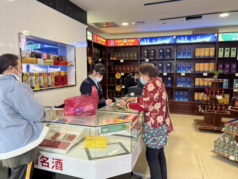 五一期間,宣城商廈自營煙酒柜商品豐富并參與工行刷卡滿減活動,營業(yè)剛開始顧客就趕來交款。