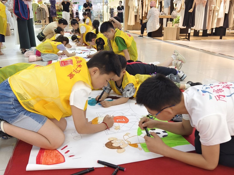 活動(dòng)現(xiàn)場(chǎng),白色的畫(huà)卷在商場(chǎng)走道上一字鋪開(kāi),孩子們姿態(tài)各異,盡情地涂抹勾畫(huà),用靈巧的雙手和豐富的想象力,通力合作將長(zhǎng)長(zhǎng)的畫(huà)卷變成了一件色彩斑斕的藝術(shù)品。