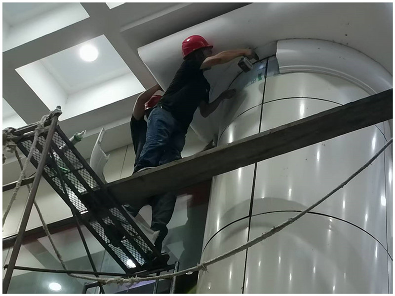 霍邱商廈一樓大廳立柱頂部圓弧造型出現(xiàn)斷層、下沉,鋁塑板脫膠翹起,隨時(shí)存在高空物體墜落傷人的風(fēng)險(xiǎn)。公司領(lǐng)導(dǎo)高度重視,立即安排綜合部及時(shí)搶修。