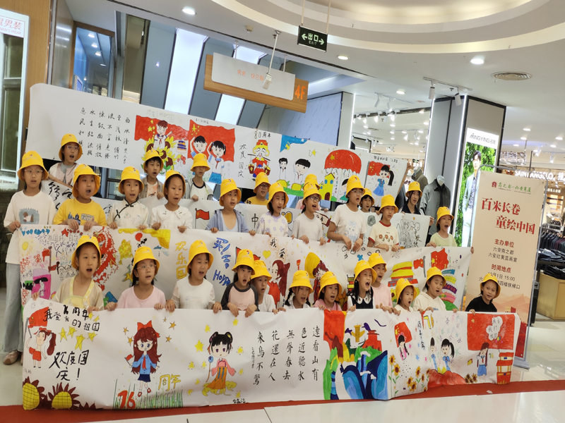 10月1日兩場(chǎng)活動(dòng)吸引眾多市民參與,清晨,不少市民攜老帶幼匯聚商場(chǎng)廣場(chǎng),共同見證升旗儀式,雄壯國(guó)歌聲中,五星紅旗緩緩升起,大家手持國(guó)旗肅立行注目禮,齊唱國(guó)歌,現(xiàn)場(chǎng)莊重而熱烈。當(dāng)日下午,商廈聯(lián)合紅黃藍(lán)書畫苑組織30名孩子開展“百米長(zhǎng)卷 童繪中國(guó)”活動(dòng),孩子們以畫筆勾勒祖國(guó)壯麗山河,書法對(duì)祖國(guó)的熱愛與祝福。