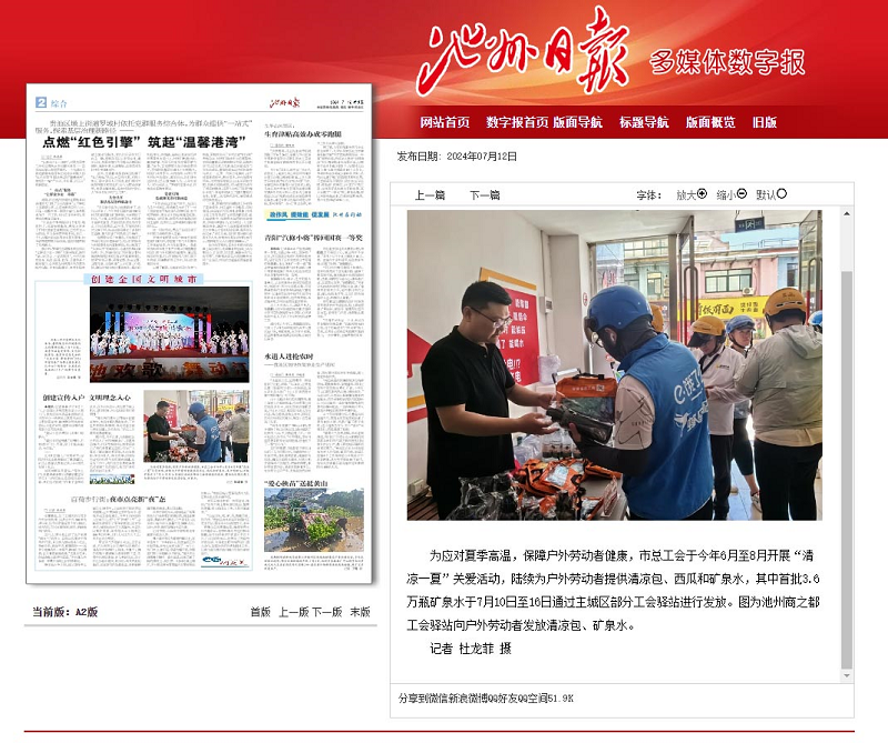 連日來,持續(xù)的高溫,“烤”驗著池城的戶外勞動者們。池州購物中心積極踐行國有企業(yè)的責任與擔當,7月以來,在工會驛站開展“送清涼”活動,陸續(xù)為外賣小哥、環(huán)衛(wèi)工人等戶外勞動者送上清涼包、戶外水壺、礦泉水等防暑降溫物品。池州商之都工會驛站“送清涼”活動受到了池州日報的關(guān)注和報道。