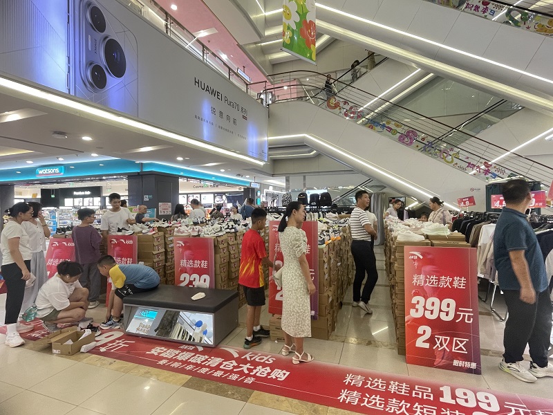 活動現(xiàn)場人頭攢動,鞋品、童裝展區(qū)選購氛圍火熱,尤其“399元2雙”專區(qū)人氣最旺,主題地貼更添促銷氛圍。最終實現(xiàn)銷售同比上升76.28%,創(chuàng)下暑期營銷佳績。